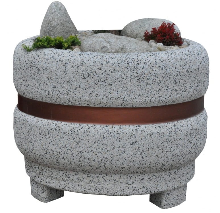 Donica betonowa okrągła śr.100 wys.80 z pasem   77266 Donice parkowe betonoweŚrednica (cm): 100 Wysokość (cm): 80 Waga (kg): około 550 Materiał: kamień rzeczny, grysy   Jak można wykorzystać betonową donice o średnicy 100 cm i wysokości 80 cm? Na wiele różnych sposobów. Wiedzą o tym wszyscy klienci, którzy już dokonali metamorfozy ogrodu, parku czy przestrzeni, w której prowadzą biznes. Wiele zależy od detali, takich jak właśnie donice służące eksponowaniu i prawidłowej uprawie roślin. Waga poniższego modelu (550 kg) zapewnia niezbędną stabilność. Przekonaj się, że warto zwracać uwagę nawet na takie szczegóły jak rodzaj wykończenia – kamień rzeczny czy grys. Do tego dochodzi estetyczny detal w postaci pasa miedzianego przebiegającego przez środek donicy. Przemyśl, czy akurat ten rozmiar pasuje do kwiatów, krzewów czy drzewek, które pragniesz zasadzić w otoczeniu, którym zarządzasz.