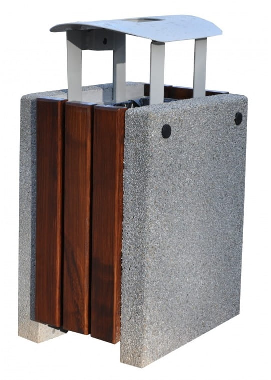 Kosz betonowy kwadratowy 50L z listwami drewnianymi 77152 (kosze parkowe) Wysokość (cm): 90, bez daszka (cm): 73 Szerokość (cm): 51 -51 Pojemność (l): 50 Waga około (kg): 200 Materiał: kamień płukany, grysy, drewno, stal. Oddajemy do Twojej dyspozycji bardzo przyjemnie wyglądający kosz, który spełnia nie tylko praktyczną, ale również estetyczną funkcję. Na tle pozostałych modeli wyróżnia się przede wszystkim dwoma elementami: drewnianymi listwami zamontowanymi po dwóch stronach oraz daszkiem, który chroni wnętrze śmietnika przed śniegiem i deszczem. Trwałość jest zresztą jego kolejną ważną właściwością stanowiącą o jego wysokiej jakości. To efekt zastosowania betonu jako głównego materiału do produkcji, dzięki czemu nawet skrajne warunki atmosferyczne nie są w stanie zniszczyć tego modelu. Docenia się go za pojemność wynoszącą 50 l. To znakomity wybór głównie do parków i terenów zielonych, ale również w warunkach miejskich sprawdzi się bardzo dobrze.